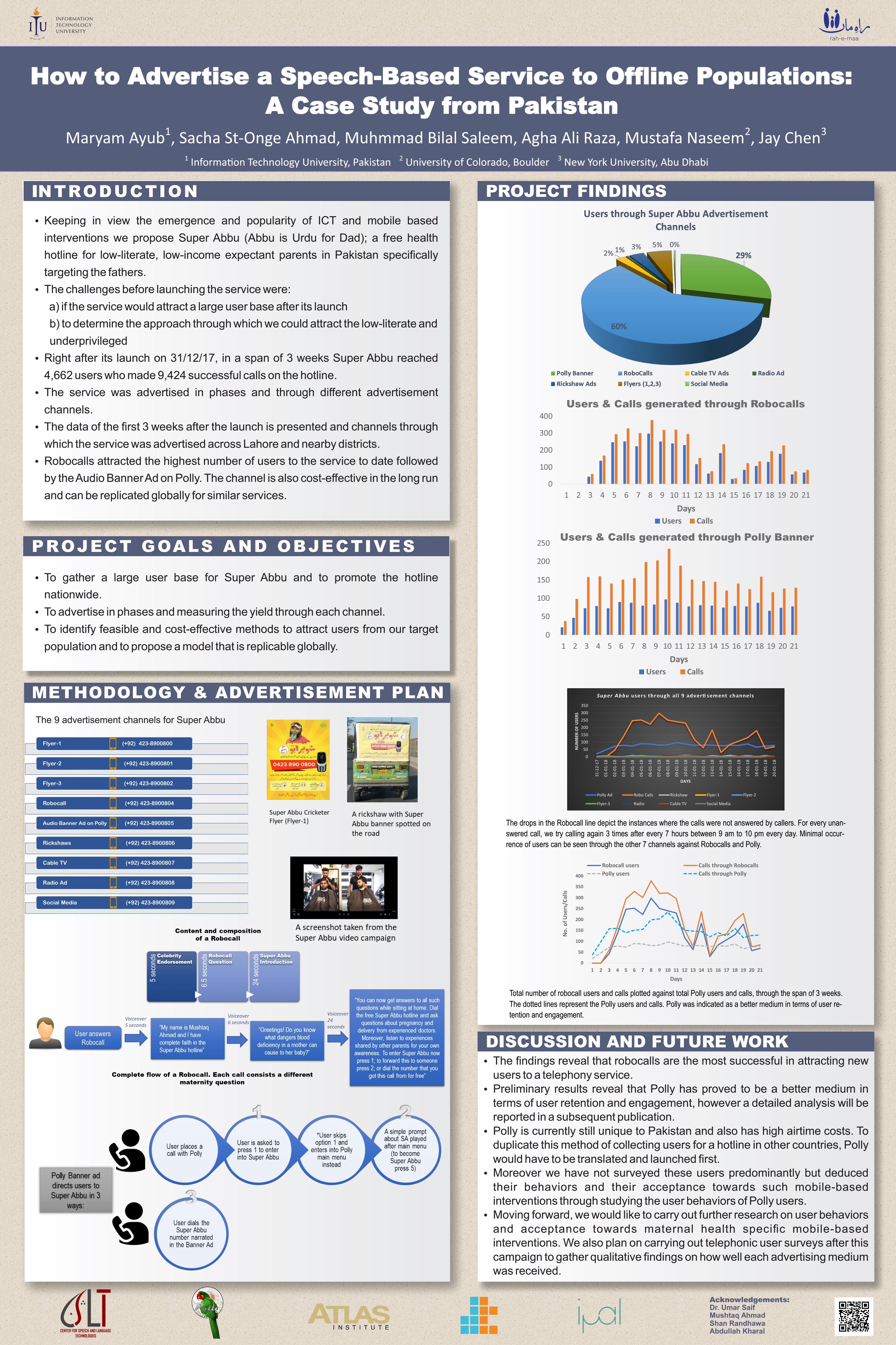 - Maryam Ayub, Sacha St-Onge Ahmad, Bilal Saleem, Agha Ali Raza, Mustafa Naseem, Jay Chen, How to Advertise a Speech-Based Service to Offline Populations: A Case Study from Pakistan, In HCI Across Borders Symposium at Conference on Human Factors in Computing Systems. Apr 21-26, 2018, Montreal, Canada. (Poster)