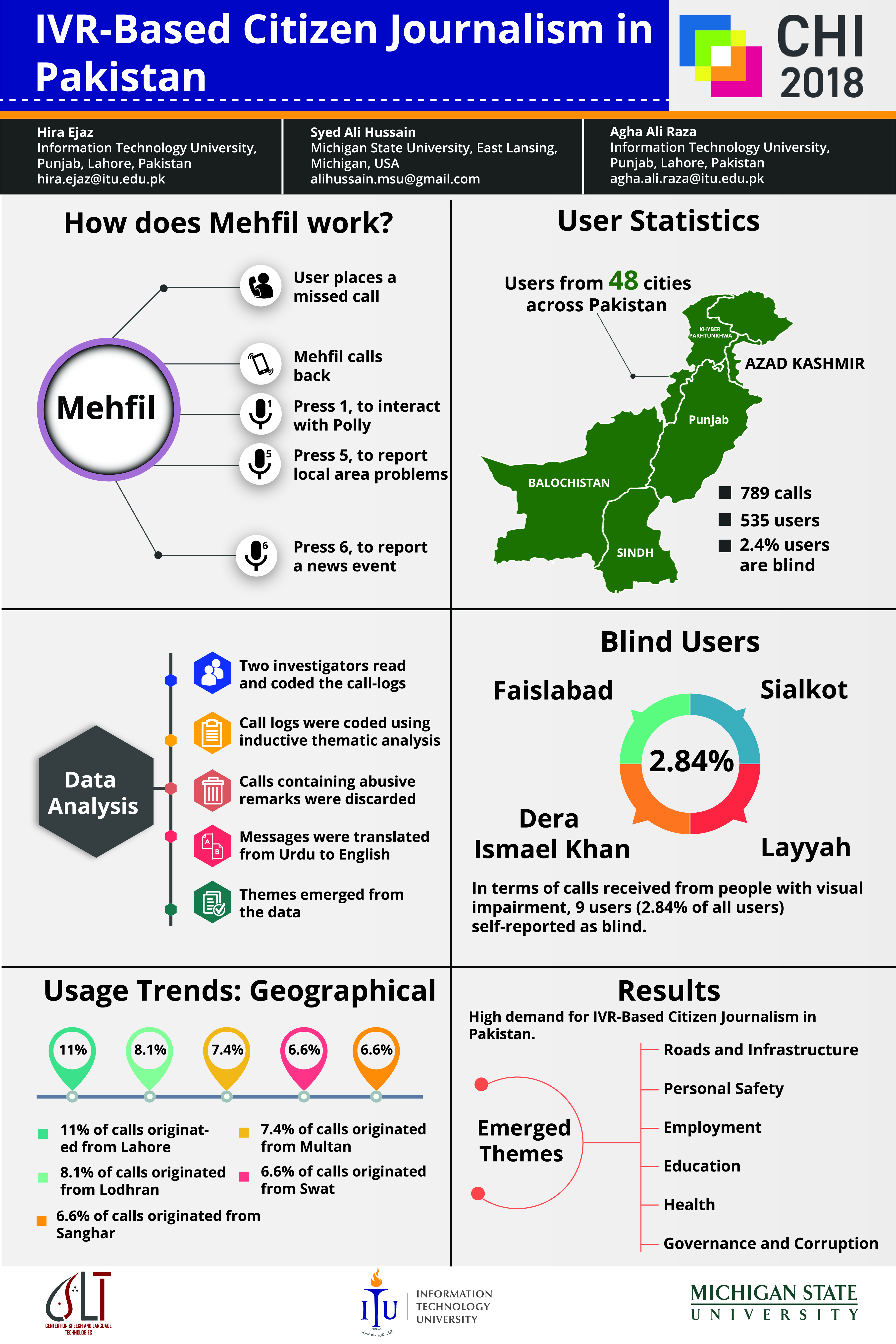 - Hira Ejaz, Syed Ali Hussain, Agha Ali Raza, IVR-Based Citizen Journalism in Pakistan, In HCI Across Borders Symposium at Conference on Human Factors in Computing Systems. Apr 21-26, 2018, Montreal, Canada. (Poster)